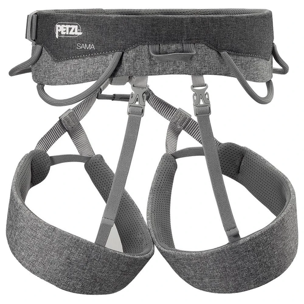 Le Petzl Sama est un harnais léger et agréable à porter. La ceinture est travaillée sur la partie avant pour avoir un maximum de mobilité mais reste épaisse sur l’arrière pour être ultra confortable. Il est doté de tours de cuisses élastiques qui restent bien ajustés et d’un tour de taille réglable avec une boucle. Il est pourvu de quatre porte matériel, deux rigides et deux souples, ainsi que d’un anneau pour sac à pof ou autre.