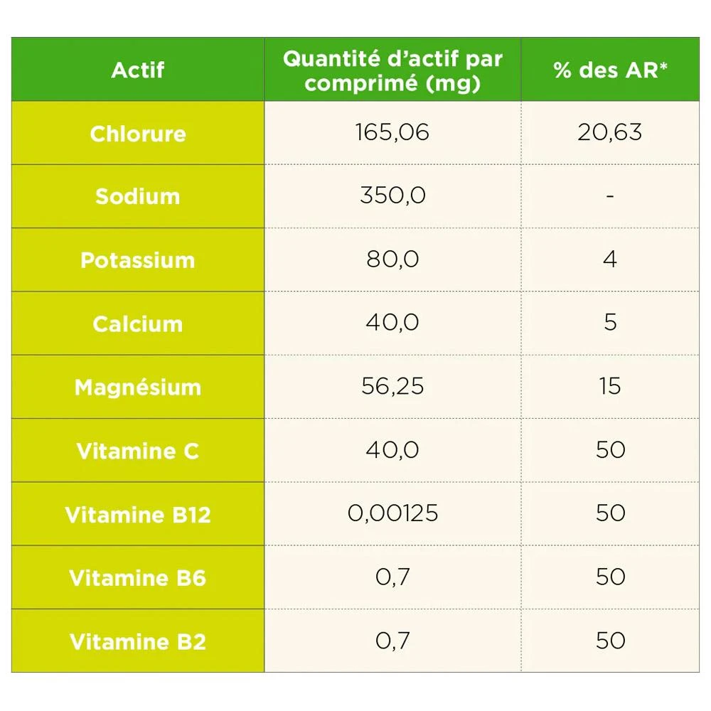 - Ingrédients : Acidifiants : acide citrique – Edulcorant : sorbitol – bicarbonate de sodium – chlorure de potassium – chlorure de sodium – arôme naturel – carbonate de calcium – oxyde de magnésium – Colorants naturels – Edulcorant : saccharinate de sodium, sucralose – vitamines : C, B12, B6, B2