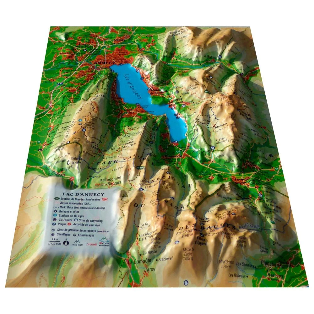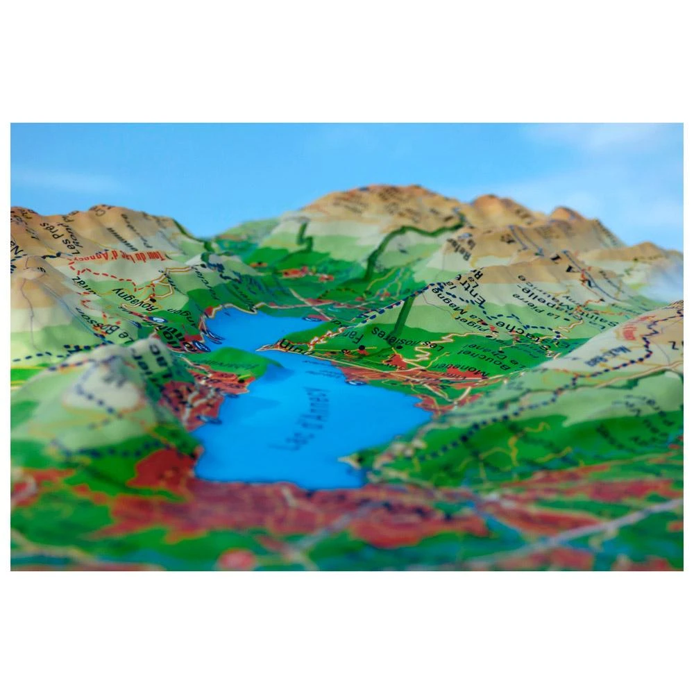 Les cartes 3DMAP sont fabriquées en France et apportent une nouvelle dimension à la cartographie, au sens propre comme figuré. Grâce à un logiciel de traitement 3D développé spécifiquement pour ces cartes, on obtient un niveau de finition tout à fait exceptionnel, rendant ces cartes aussi belles que détaillées. Dans ce modèle, c’est toute la magnifique région du lac d’Annecy que vous retrouverez, avec ses glaciers, ses sommets et les sentiers de GR à découvrir. Voyez le Semnoz du dessus et explorez la région du bout des doigts.
