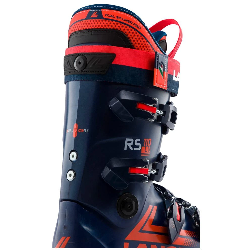 La Lange RS 110 MV est une chaussure haut de gamme développée par le service course de Lange. Elle est dotée d’une construction Dual Core en polyuréthane offrant un bon contrôle du flex et un regain d’énergie à la chaussure. Son flex de 110 est puissant, apporte une belle dose de soutien dans les appuis, sans pour autant être une chaussure nécessitant d’être engagé à 200 % à chaque descente. Son chausson anatomique, le Dual 3D Pro, enveloppe le pied du skieur pour gagner en précision, en transmission d’énergie et en confort. Son serrage est composé de 4 boucles Alu Race Micro, combiné à un power strap d’une largeur de 40 mm. Enfin, le fit neutre est idéal pour un pied moyen et/ou pour un skieur qui cherche un bon équilibre entre précision et confort d’accueil. Cette chaussure sera parfaite pour un skieur confirmé qui veut une chaussure puissante sans être trop fatigante, avec laquelle il pourra envoyer sur piste ou en all-mountain.
