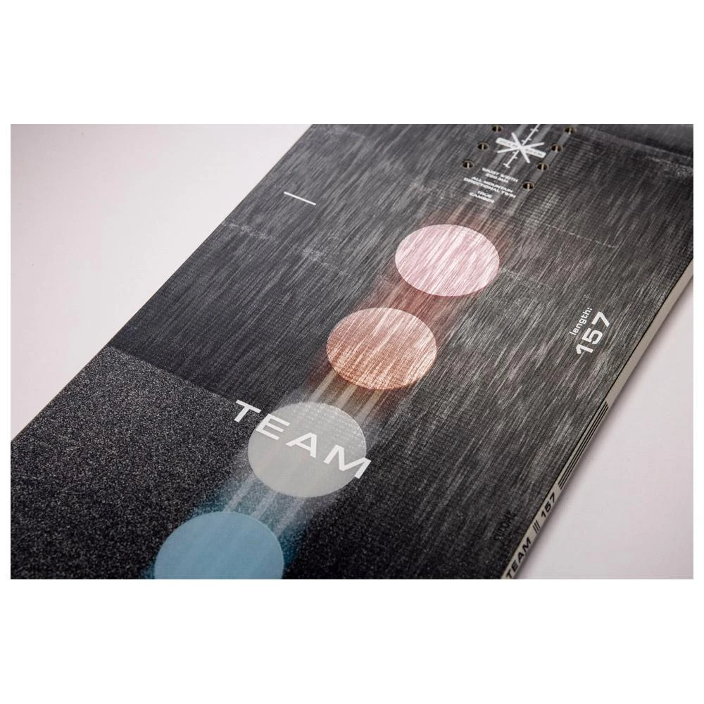 La Nitro Team est dotée d’un shape twin directionnel qui permet d’avoir beaucoup de polyvalence et de maniabilité tout en gardant de belles aptitudes en freestyle. En effet, puisque le tail et le nose sont symétriques, il est possible de faire du switch, et avoir un vrai tail peut aussi être un atout même pour les tricks qui ne demandent pas à passer en switch. Le côté directionnel, avec des inserts légèrement reculés vers l’arrière, permet de faciliter l’enclenchement des virages (quand vous n’êtes pas en switch) et apporte en plus une déjauge automatique dans la poudreuse. Côté construction, on retrouve un noyau bois renforcé de fibres de verre, quelque chose de très classique donc, qui apporte un flex pêchu tout en gardant de la jouabilité aux spatules. Enfin, le cambre classique bien marqué sur toute la longueur de la board offre une très bonne tenue de carre sur neige dure et damée et permet de profiter à fond de l’énergie du noyau bois pour popper de gros ollies, aller chercher du rebond dans les virages en carving, etc.